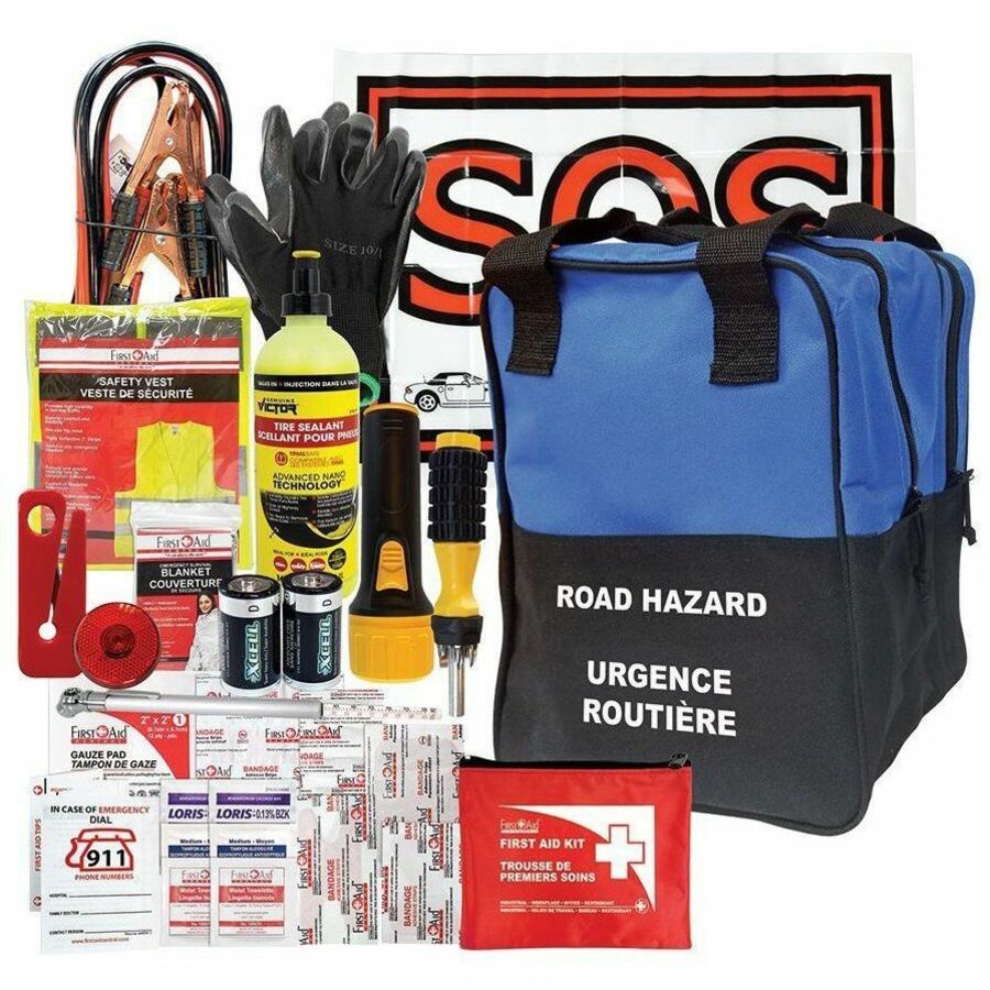Essential tools such as jumper cables, siphon pump and tire pressure gauge. Includes important safety equipment such as safety vest, SOS flag and flashlight with batteries. Quick Fix tire sealant included. First aid kit included. Carefully packaged in a h